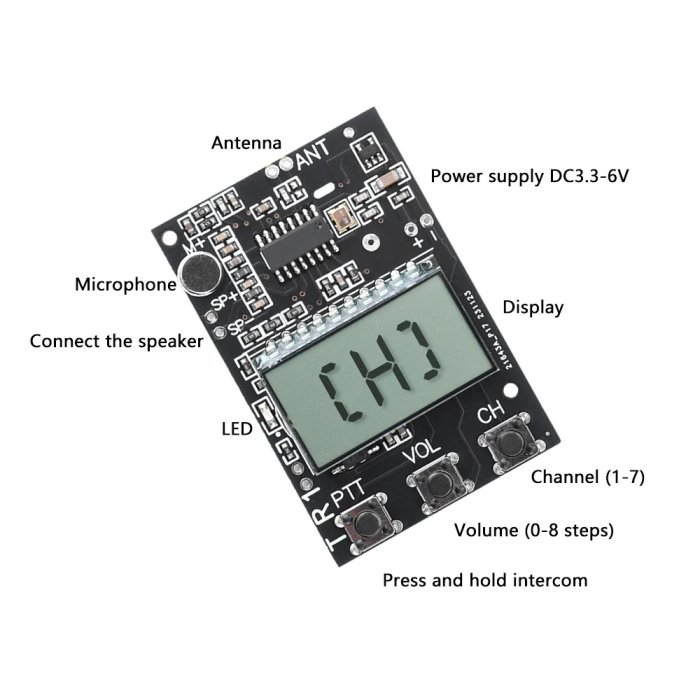 Управление в простом варианте сводится к трём кнопкам: PTT для передачи, VOL для регулировки громкости (0–8) и CH для переключения каналов (1–7). Второй прототип можно собрать по той же схеме, изменив корпус или крепления.