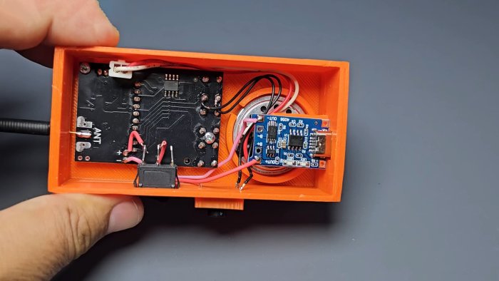 - Подключите питание от литий‑ионного аккумулятора через выключатель; для зарядки используйте TP4056.