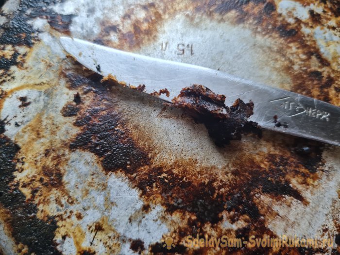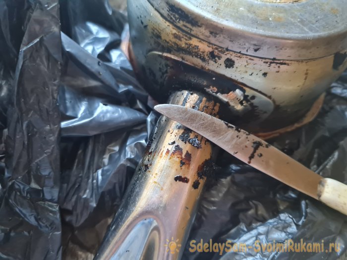 - Утром аккуратно откройте пакет и снимите размягчённый нагар с помощью неострого ножа, пластикового скребка или губки.