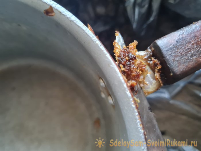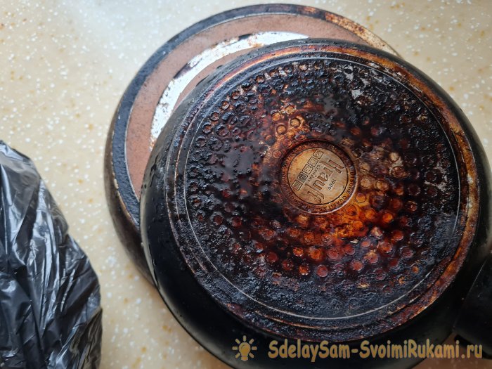 Простой и недорогой метод — нашатырный спирт в плотном пакете — помогает убрать многодневный нагар с металлической посуды. Он отлично работает с большинством изделий, но для керамики, стекла и чугуна результат может быть неудачным.