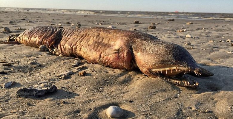 После урагана «Харви» на берег Техас-Сити выбросило необычную морскую тварь: удлинённое, похожее на угря тело без видимых глаз и с острыми зубами.