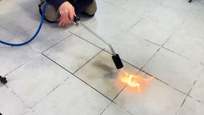 - Прогрейте плитку. Равномерно прогрейте поверхность газовой горелкой или строительным феном. Тепло размягчит остатки клея под плиткой и снизит риск её растрескивания.