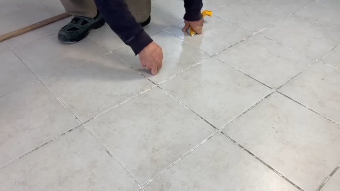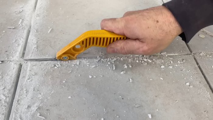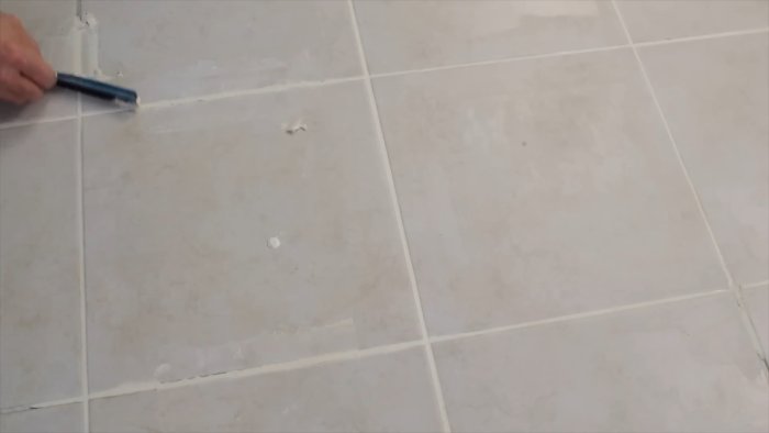 - Удалите затирку. По периметру плитки аккуратно срезайте затирку монтажным ножом, чтобы не задеть соседние плитки и не повредить кромку.