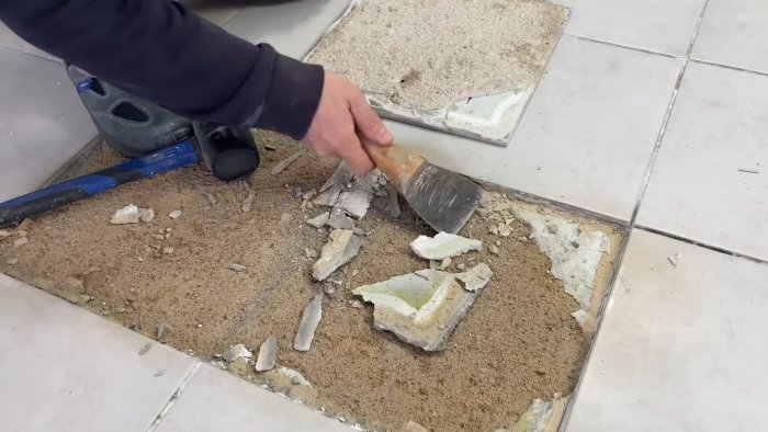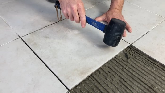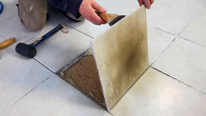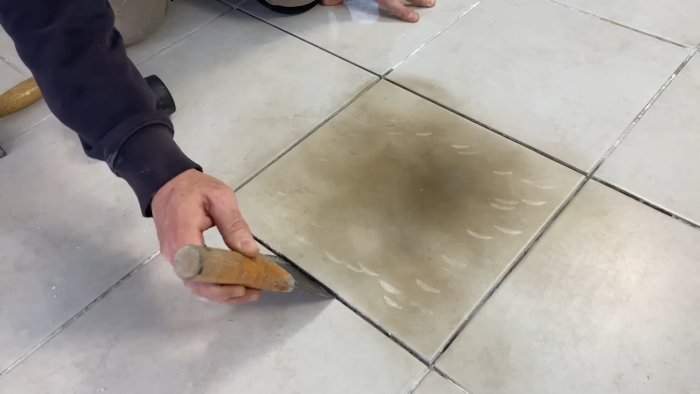 - Разбейте клей остаточно. Несильными ударами резиновой киянки простучите плитку по всей поверхности — это поможет разрушить сцепление клея с основанием.