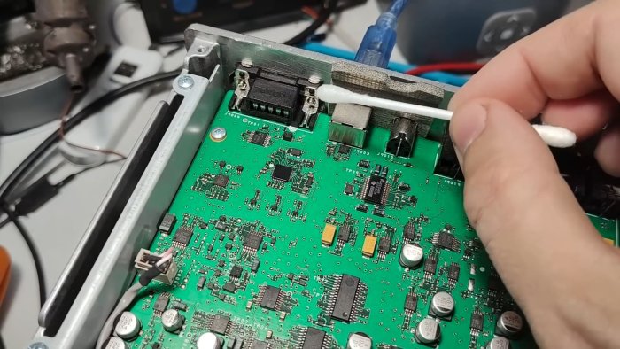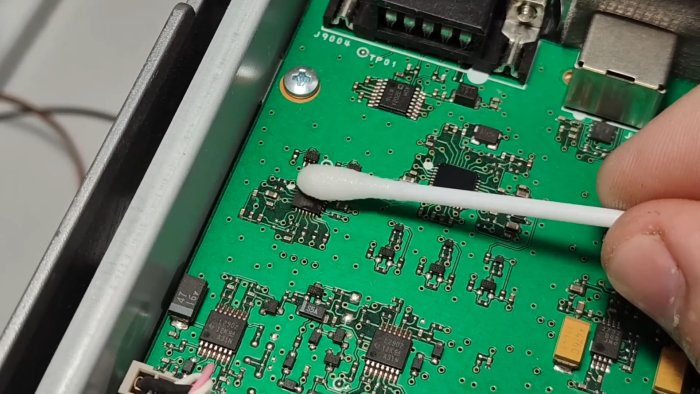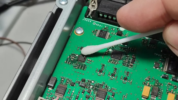 - Лёгкими движениями пройдитесь ватой по подозрительным участкам платы — по контактам и корпусам микросхем.