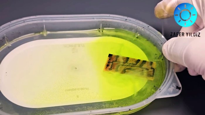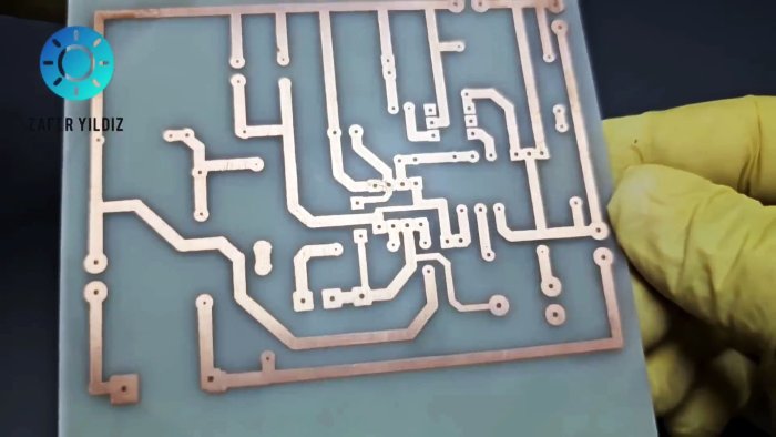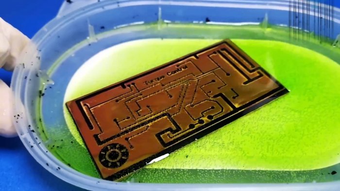 Медь протравливается в незащищённых местах. Получается плата высокой чёткости.
