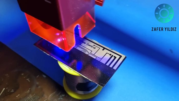 Плату покрывают чёрной эмалью. Лазерным гравером выжигают рисунок, удаляя краску с нужных участков. Затем заготовку помещают в травильный раствор.