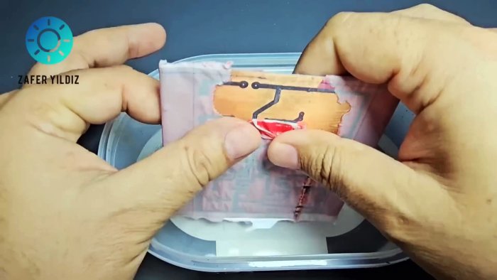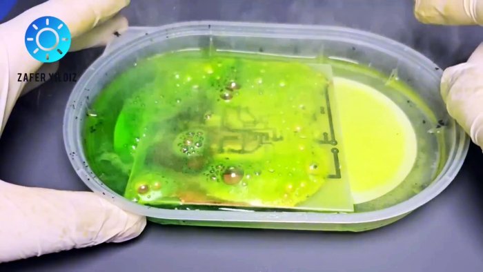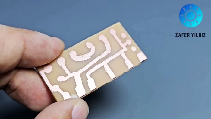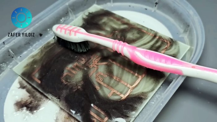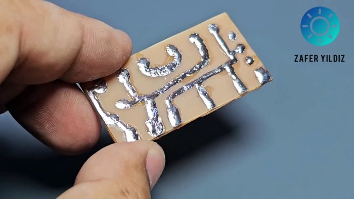 Расплавленный тонер переносится на фольгу. Бумагу размачивают и удаляют. Далее — стандартное травление. Тонер смывают. Результат — аккуратные дорожки.