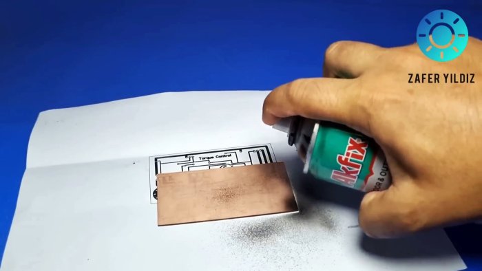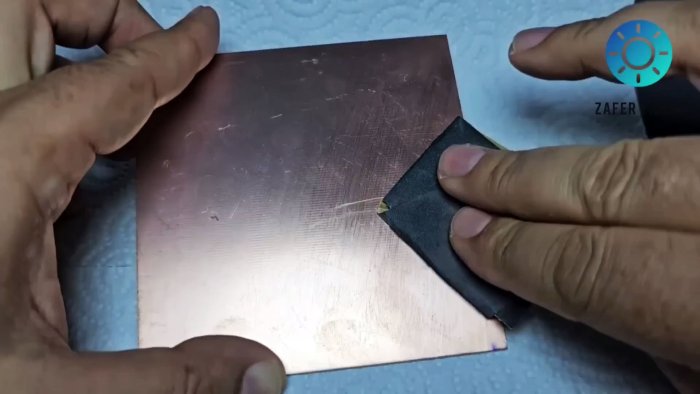 Схему печатают на глянцевой бумаге. Текстолит тщательно зачищают и обезжиривают. Бумагу с тонером прикладывают к меди и проглаживают горячим утюгом.