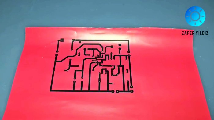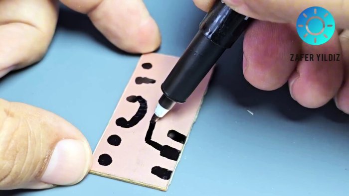 Нанесите рисунок проводников прямо на зачищенную медную фольгу. Контур должен быть чётким. После этого плату травят в растворе. Защищённый маркером металл останется.