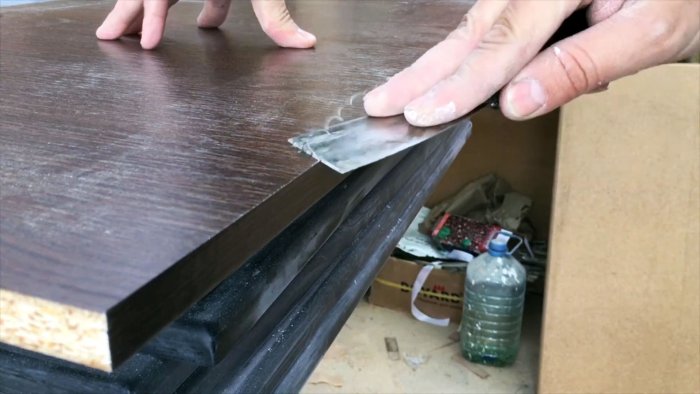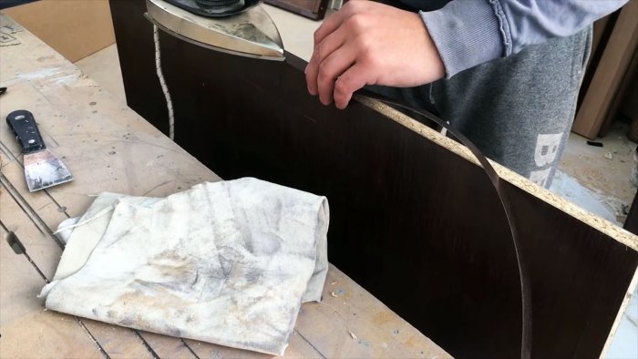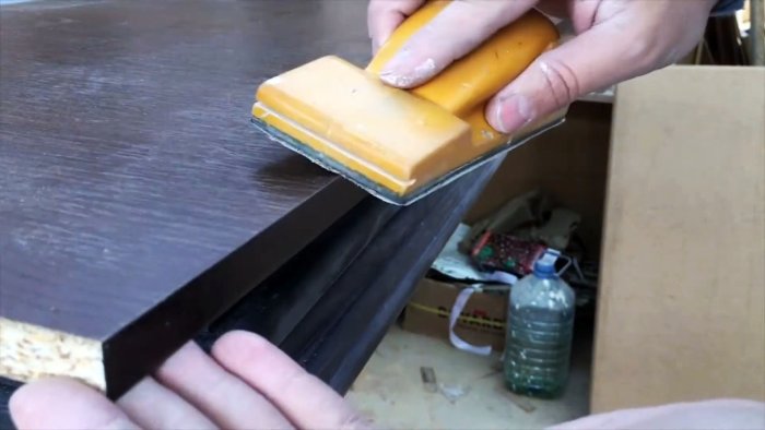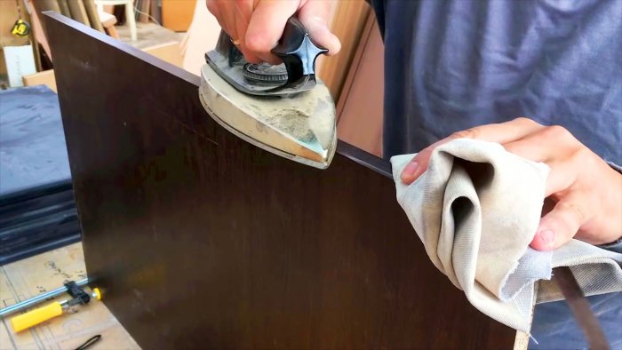 - Нанесённый клей на торец или клеевая сторона кромки схватывают утюгом, проводя им вдоль детали и прижимая с достаточной силой.