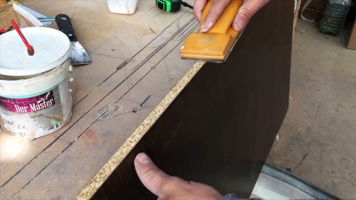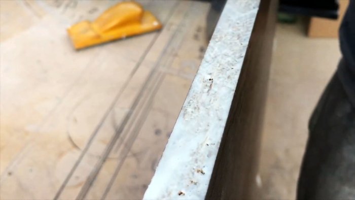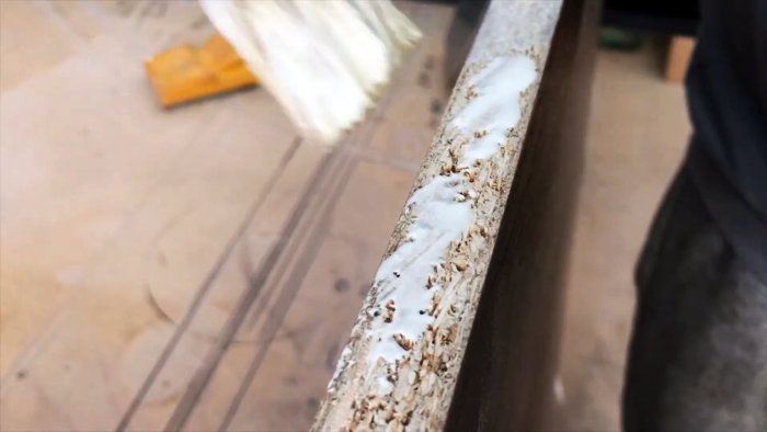 Сначала выравнивают спил наждачной бумагой — убирают заусенцы и неровности. После этого торец лучше пропитать влагостойким клеем с маркировкой D4: такой клей проникает в структуру ДСП и делает край монолитным, без микрозазоров, через которые может подбираться влага.