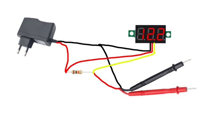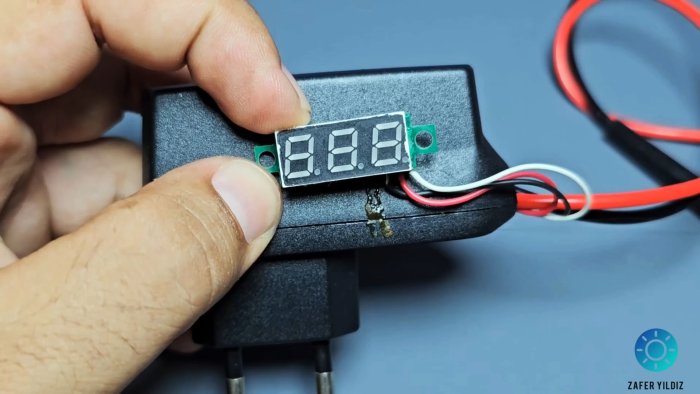 - Хорошо изолируйте все провода и резистор (термоусадкой или изолентой). Соберите корпус обратно, закрепите вольтметр горячим клеем на боковой стенке корпуса.