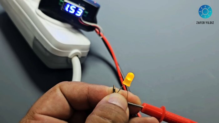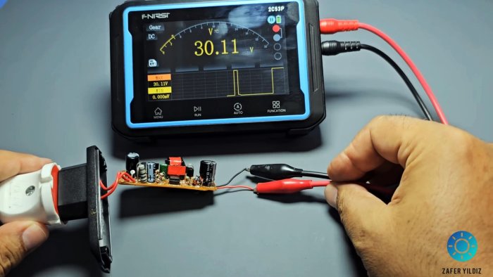 Стандартная зарядка выдаёт около 5 В. Чтобы получить около 30 В, выпаивают штатный ограничительный стабилитрон и конденсатор, затем впаивают последовательно два стабилитрона 12 В и 18 В и устанавливают высоковольтный конденсатор 2,2 µF на 400 В. Трёхпроводной вольтметр питается от блока, а его белый провод используется как измерительный вход через резистор 10 кОм. При разомкнутых щупах вольтметр показывает ~30 В, при подключении компонента — напряжение его работы.