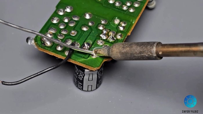 - Впаяйте новый конденсатор 2,2 µF 400 В на место старого, соблюдая полярность.