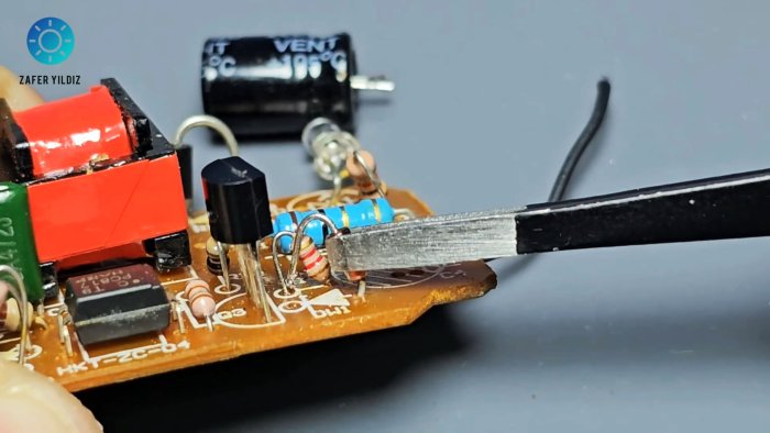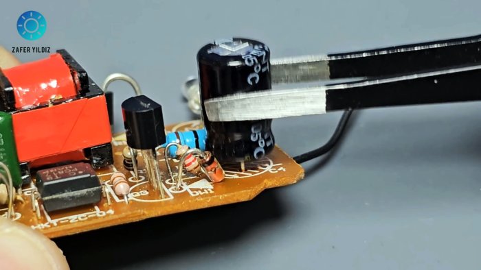 - Найдите и выпаяйте выходной электролитический конденсатор (часто он на номинал 10 В) и штатный стабилитрон (~5 В).