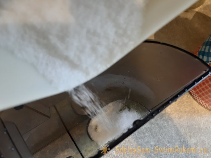 - Насыпьте в чистый сухой резервуар 1–2 столовые ложки пищевой соли.