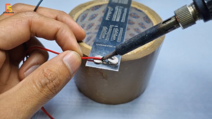 - Припаяйте провода к неодимовым магнитам для создания универсальных контактов под любой тип батарей.