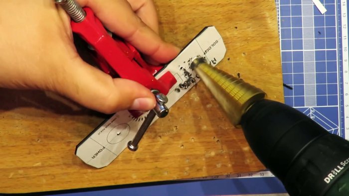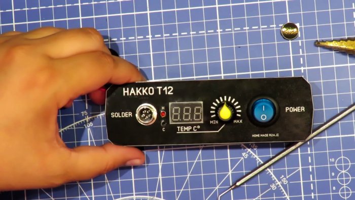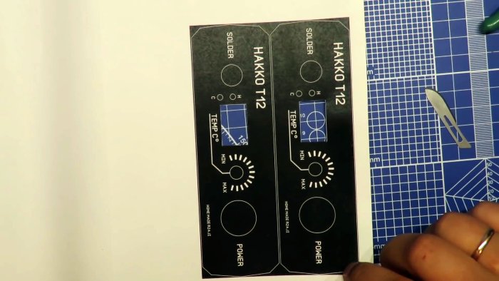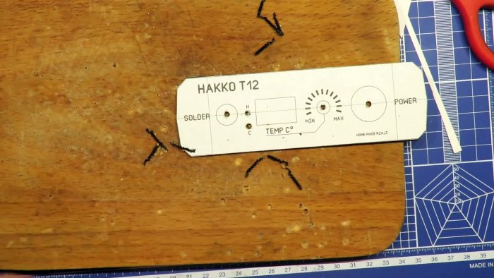 Вырежьте ламинированный макет по контуру и приклейте к панели. Установите ручки, переключатели и разъемы, подгоните элементы по месту. В результате получается аккуратная, яркая и практичная панель, которая превращает самодельный прибор в законченный продукт.
