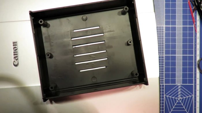 Для начала разберите корпус: отпустите саморезы и аккуратно разделите верхнюю и нижнюю половинки, отделив переднюю и заднюю панели. Чтобы получить точный шаблон, отсканируйте панель в масштабе 1:1 на сканере. Если сканера нет, можно сделать снимок на телефон, но потребуется подгонять размер в редакторе.