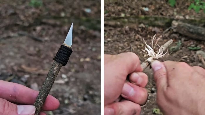 - Тонкое лезвие (маленький нож) — спрятано в корпусе и при необходимости крепится к палке.