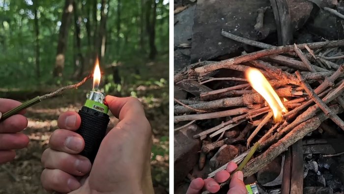 Обмотайте корпус зажигалки синтетической верёвкой, оставив один конец свободным — он пригодится в качестве рабочей нити. Поверх верёвки можно проложить клейкую ленту, чтобы закрепить комплект и защитить от влаги. Джутовую бечёвку фиксируют рядом с клапаном пламени так, чтобы её можно было быстро поджечь.