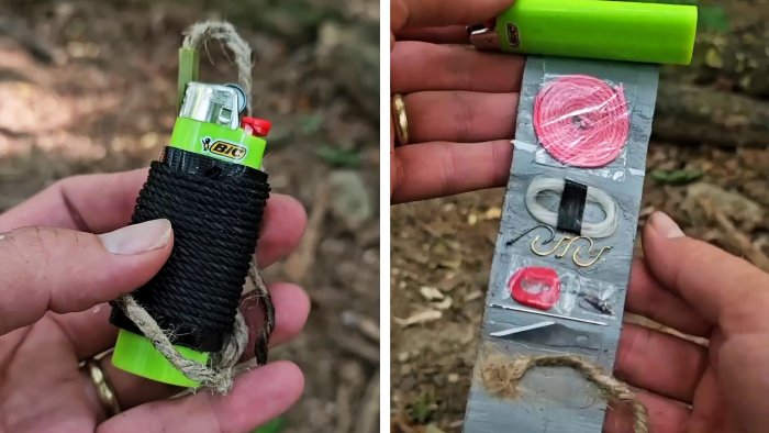 В основе — простая газовая зажигалка. К ней добавляют несколько недорогих и лёгких компонентов, которые увеличивают шансы развести костёр, починить снаряжение или поймать рыбу. Важный принцип — ничего лишнего, только проверенные и практичные вещи.
