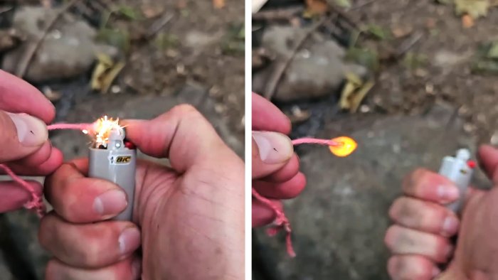 Джутовый фитиль, пропитанный воском, позволяет получить более яркое и длительное пламя, чем у простой зажигалки, и его легче поджечь в ветреную или влажную погоду. Если газ в зажигалке закончится, хлопковая пряжа и восковая бечёвка станут запасным розжигом, который можно вывести огнивом.