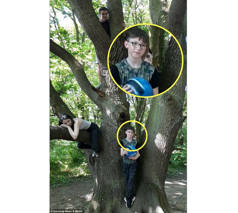 Обычный снимок подростков у дерева превратился в загадку: женщина увидела на фото отчетливую детскую голову, выглядывающую из-за плеча своего сына.