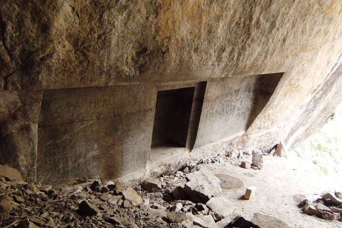 Первый «портал» представляет собой аккуратно вырезанную в скале нишу: идеальные линии, ровные углы и тщательно отполированные поверхности выглядят так, будто для работы применяли современные инструменты. Рядом стоят второй портал и остатки каменного жилища, которые вместе создают ощущение тщательно спланированного архитектурного ансамбля.