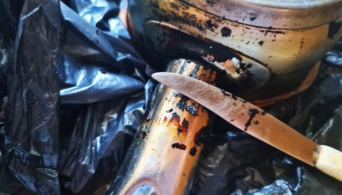 Простой и недорогой метод — нашатырный спирт в плотном пакете — помогает убрать многодневный нагар с металлической посуды. Он отлично работает с большинством