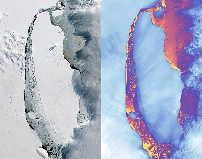 Спутники НАСА впервые сделали детальные снимки гигантского айсберга А-68, отделившегося от ледника Ларсена этим летом, и зафиксировали первые признаки его распада на части.