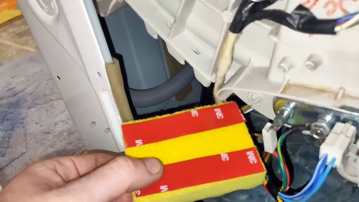 - Отрежьте небольшой фрагмент от губки. Размер должен быть достаточным, чтобы перекрыть место соприкосновения шланга с углом корпуса.