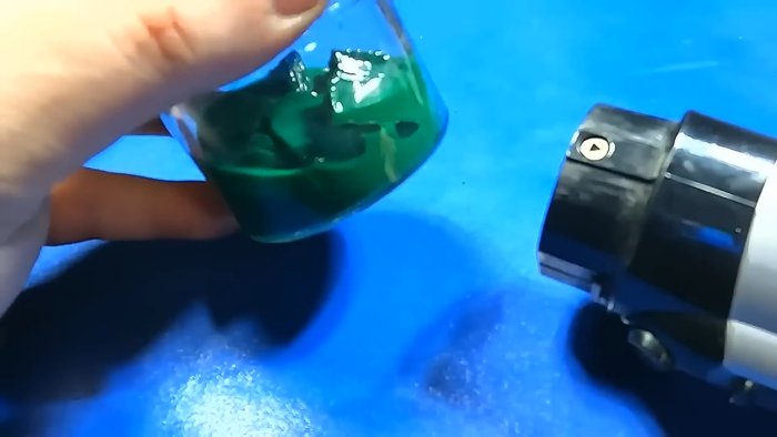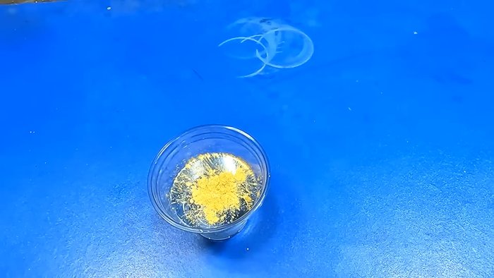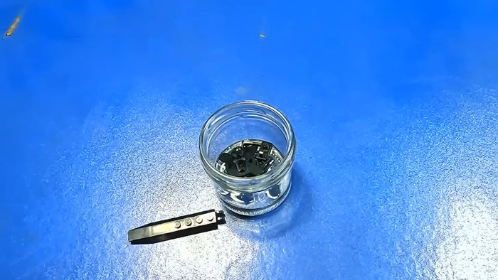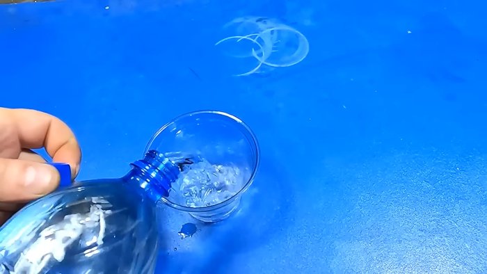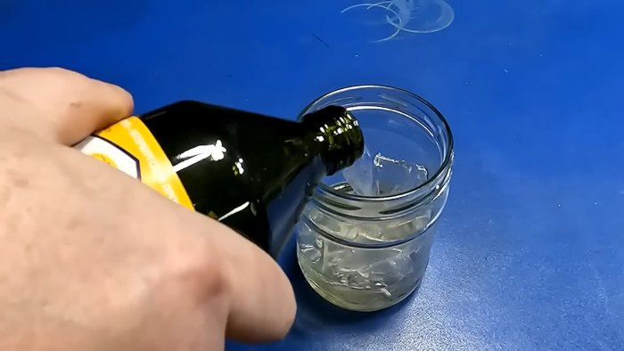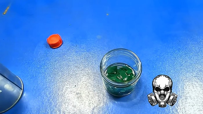 - Поместите пластик в стеклянную ёмкость и добавьте растворитель — ацетон или дихлорметан.