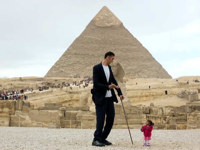 В Каире состоялась необычная встреча: 35‑летний турок Султан Кёсен, признанный самым высоким человеком в мире, встретился с 24‑летней индианкой Джоти Амджи, самой низкой женщиной на планете.
